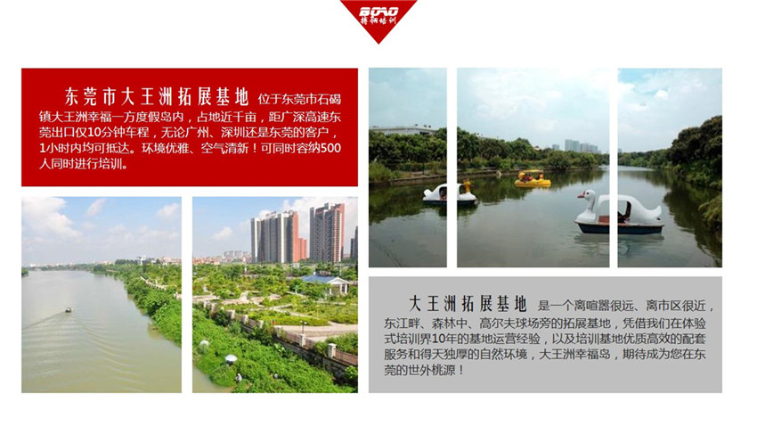東莞市大王洲拓展基地位于東莞市石碣鎮(zhèn)大王洲幸福一方度假島內(nèi),占地近千畝,距廣深高速東莞出口僅10分鐘車程,無(wú)論廣州、深圳還是東莞的客戶,1H內(nèi)均可抵達(dá)。環(huán)境優(yōu)雅、空氣清新!可同時(shí)容納500人同時(shí)進(jìn)行培訓(xùn)。林蔭遍布,風(fēng)景優(yōu)美,島上屋角欲顯還藏,別有一番大自然的風(fēng)味;東江之水阻隔了來(lái)自鬧市的喧囂,島嶼上安靜寧人。遠(yuǎn)遠(yuǎn)望去,大王洲島似都市中的綠色翡翠;徜徉其間,又像是步入了人間仙境。