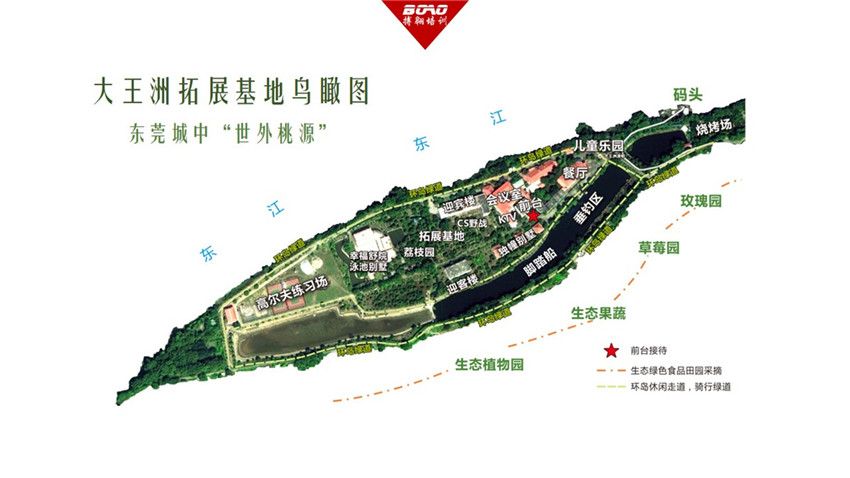 東莞市大王洲拓展基地位于東莞市石碣鎮(zhèn)大王洲幸福一方度假島內(nèi),占地近千畝,距廣深高速東莞出口僅10分鐘車程,無(wú)論廣州、深圳還是東莞的客戶,1H內(nèi)均可抵達(dá)。環(huán)境優(yōu)雅、空氣清新!可同時(shí)容納500人同時(shí)進(jìn)行培訓(xùn)。林蔭遍布,風(fēng)景優(yōu)美,島上屋角欲顯還藏,別有一番大自然的風(fēng)味;東江之水阻隔了來(lái)自鬧市的喧囂,島嶼上安靜寧人。遠(yuǎn)遠(yuǎn)望去,大王洲島似都市中的綠色翡翠;徜徉其間,又像是步入了人間仙境。