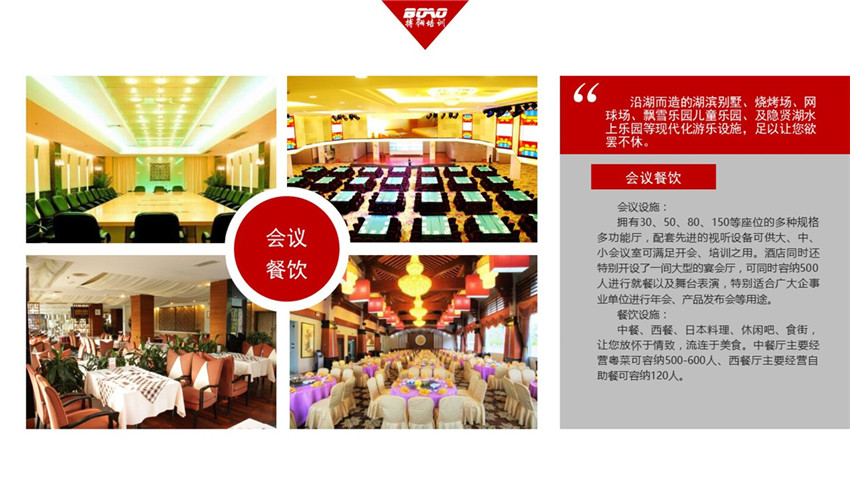 擁有30、50、80、150等座位的多種規(guī)格多功能廳,配套先進(jìn)的視聽設(shè)備可供大、中、小會議室可滿足開會、培訓(xùn)之用。酒店同時還特別開設(shè)了一間大型的宴會廳,可同時容納500人進(jìn)行就餐以及舞臺表演,特別適合廣大企事業(yè)單位進(jìn)行年會、產(chǎn)品發(fā)布會等用途。
