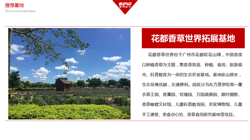 廣州花都香草世界拓展訓(xùn)練基地位于廣州市花都區(qū)花山鎮(zhèn)鐵山村,以公司加農(nóng)戶方式連片種植食用香草、食用花卉,占地面積近600多畝。花都香草世界主題定位為香草王國、繽紛樂園,以融入“珠三角經(jīng)濟(jì)圈”和“泛珠三角經(jīng)濟(jì)圈”為發(fā)展理念,打造以綠色生態(tài)、休閑度假、商務(wù)會議為主的特色旅游產(chǎn)業(yè)體系,以旅游觀光、農(nóng)業(yè)示范為主題,力爭打造成一個集休閑、旅游、度假、會議為一體的農(nóng)業(yè)科技旅游生態(tài)公園。