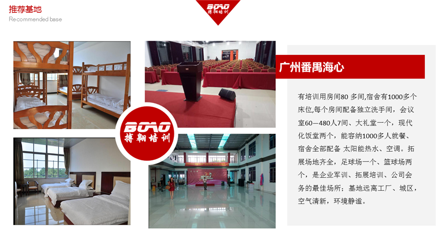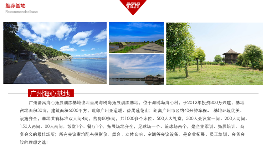 廣州番禺海心拓展訓練基地也叫番禺海鷗島拓展訓練基地,位于海鷗島海心村,于2012年投資800萬興建,基地占地面積30畝,建筑面積6000平方,毗鄰廣州亞運城、番禺蓮花山;距離廣州市區(qū)約40分鐘車程。 基地環(huán)境優(yōu)美、設施齊全,基地共有標準雙人間4間,營房80多間,共1000多個床位、500人大禮堂,300人會議室一間、200人兩間、150人兩間、80人兩間,飯?zhí)?個、餐廳1個,拓展場地齊全,足球場一個、籃球場兩個,是企業(yè)軍訓、拓展培訓、商務會義的最佳場所;所有會議室均配有投影儀、舞臺、立體音響、空調等會議設備。是企業(yè)拓展、員工培訓、會務會議的理想之選!