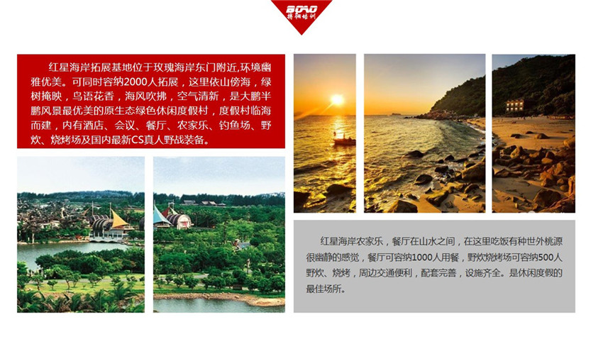 紅星海岸拓展訓(xùn)練基地位于玫瑰海岸東門附近,環(huán)境幽雅優(yōu)美??赏瑫r容納2000人做拓展訓(xùn)練,這里依山傍海,綠樹掩映,鳥語花香,海風(fēng)吹拂,空氣清新,是大鵬半鵬風(fēng)景最優(yōu)美的原生態(tài)綠色休閑度假村,度假村臨海而建,內(nèi)有酒店、會議、餐廳、農(nóng)家樂、釣魚場、野炊、燒烤場及國內(nèi)最新CS真人野戰(zhàn)裝備;紅星海岸農(nóng)家樂,餐廳在山水之間,在這里吃飯有種世外桃源很幽靜的感覺,餐廳可容納1000人用餐,野炊燒烤場可容納500人野炊、燒烤,周邊交通便利,配套完善,設(shè)施齊全。是休閑度假的最佳場所。