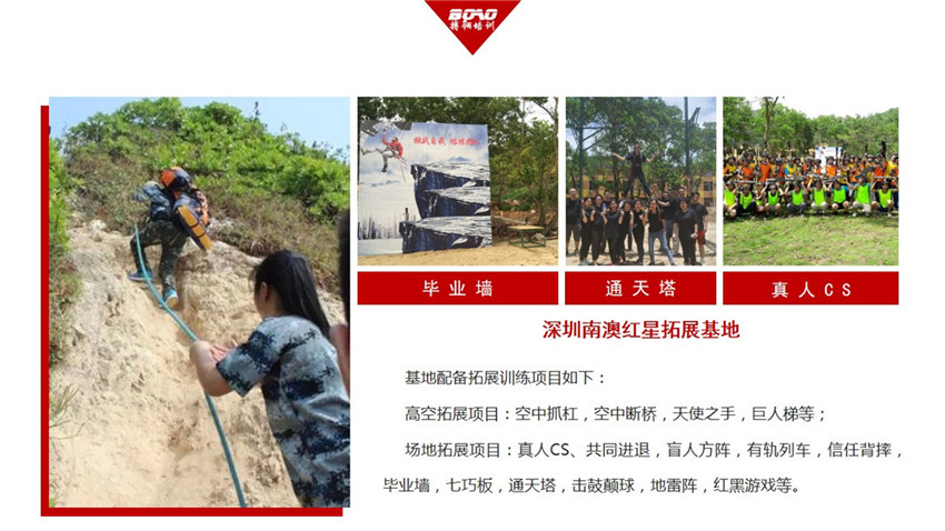 開展項目推薦:真人CS、巖降、信任背摔、求生墻、齊心協(xié)力、生死電網(wǎng)、生命之旅、盲人方陣、扎筏泅渡、高空抓杠、斷橋、緬甸橋、天梯、定向荒島生存、游泳、攀巖、野營等。