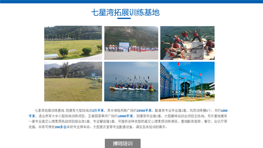 七星灣拓展訓(xùn)練基地總面積31萬平方米。集戶外運動、海上觀光旅游、培訓(xùn)、休閑、娛樂、度假、博物館、商務(wù)活動于一體,提供帆船體驗、游艇租賃、海島游、青少年及成人帆船培訓(xùn)、帆板體驗、皮劃艇體驗、拓展培訓(xùn)、潛水體驗、汽車電影、攀巖、藝術(shù)創(chuàng)作、購物、艇艇銷售、展覽、ATV試駕及住宿、餐飲、會議等配套服務(wù)。